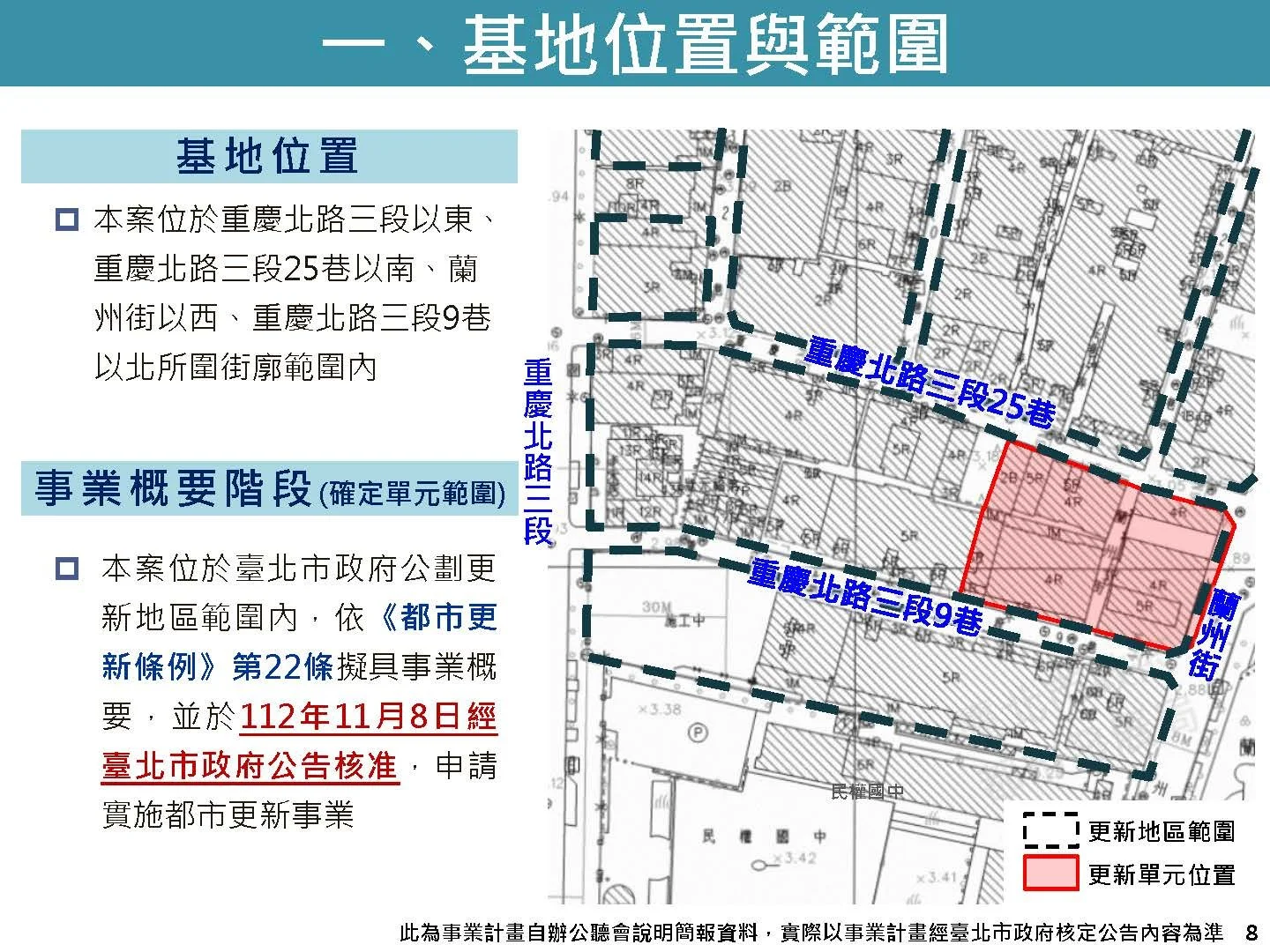 地址:蘭州街56至66號西側、重慶北路三段9巷23至31號以北、以及25巷24至32號以南所圍街廓。